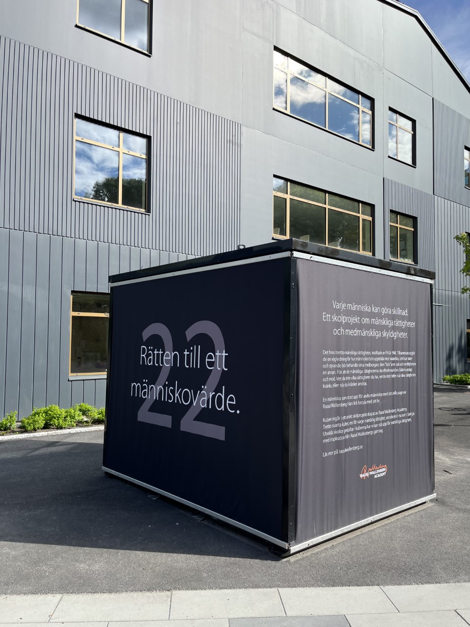 På Raoul Wallenbergskolan Bagartorp har vi blivit tilldelade artikelnummer 22: ”Var och en har, i egenskap av samhällsmedlem, rätt till social trygghet, och är berättigad till att de ekonomiska, sociala och kulturella rättigheter som krävs för hävdandet av hans eller hennes människovärde och utvecklingen av hans eller hennes personlighet, förverkligas genom nationella åtgärder och mellanfolkligt samarbete i enlighet med varje stats organisation och resurser.” (FN:s konventioner om mänskliga rättigheter) Vi har arbetat årskursvis där vi har lyft rätten att vara sig själv och kunna få samhälleliga förutsättningar oavsett etnicitet, bakgrund, kultur, ekonomi, kön och funktionsnedsättning. Vi har fokuserat på särskilda områden i olika klasser och belyst människovärde genom målningar, skulpturer och planscher. Det sitter även olika lappar med budskap på en spegel som symboliserar bland annat social trygghet och identitet.