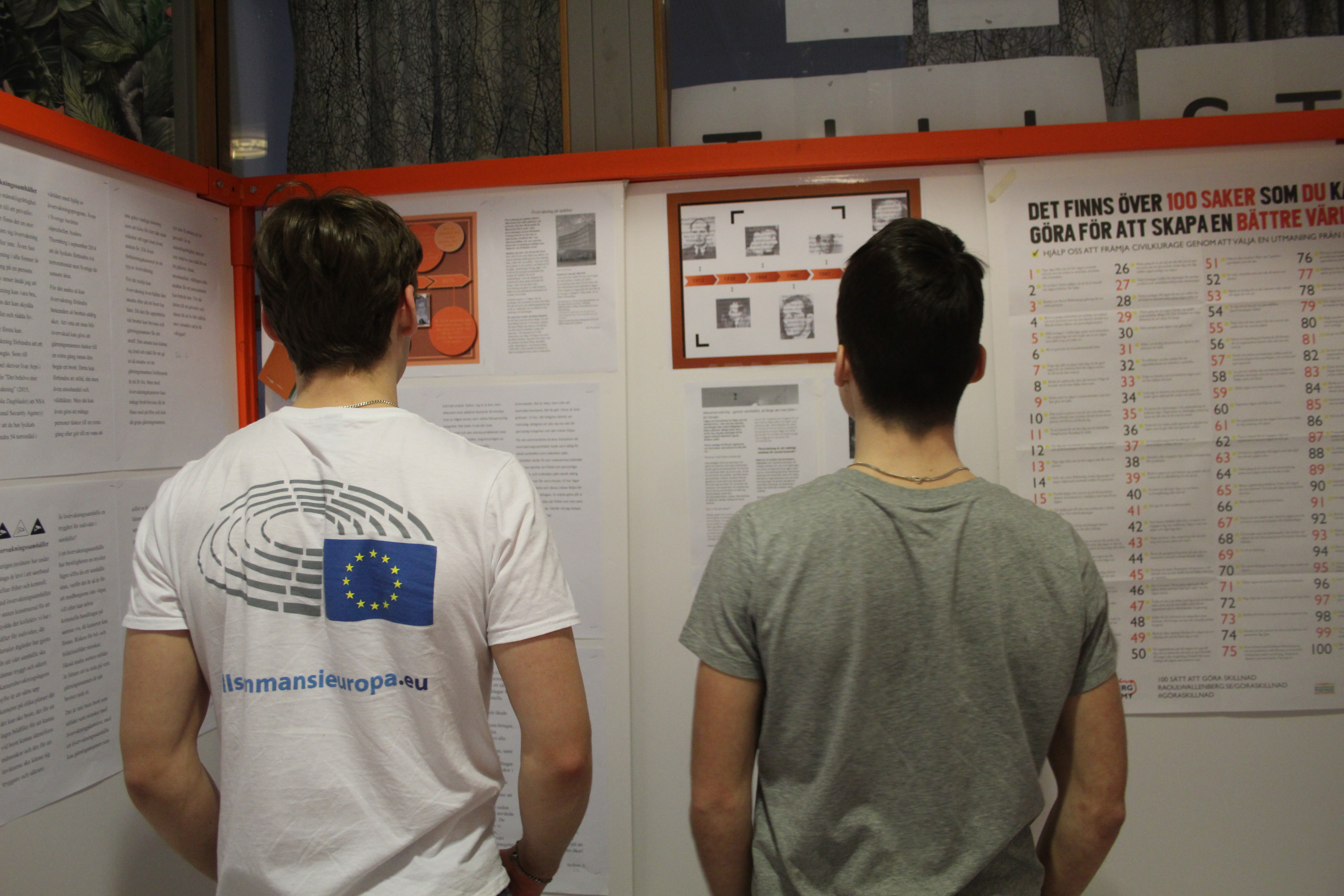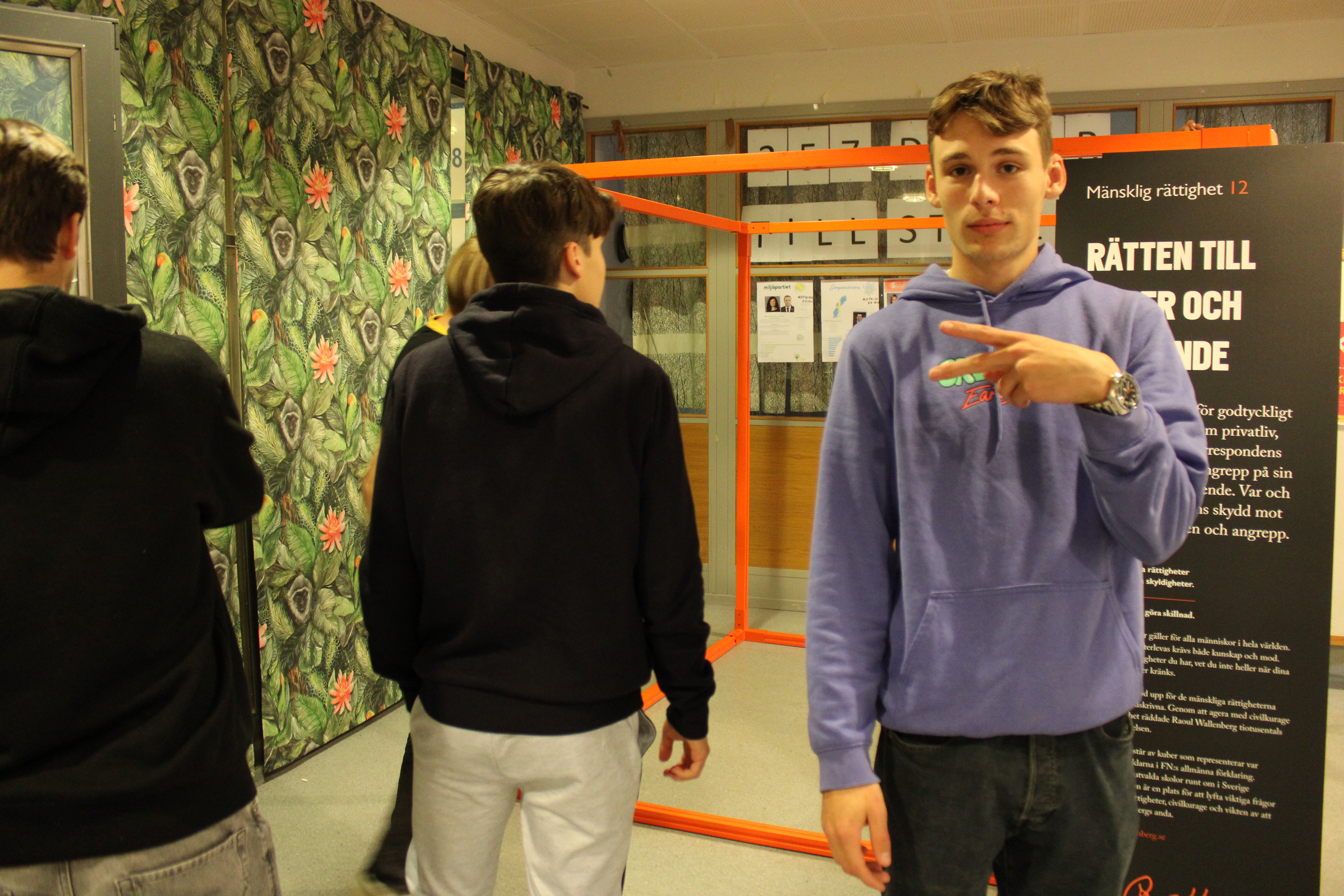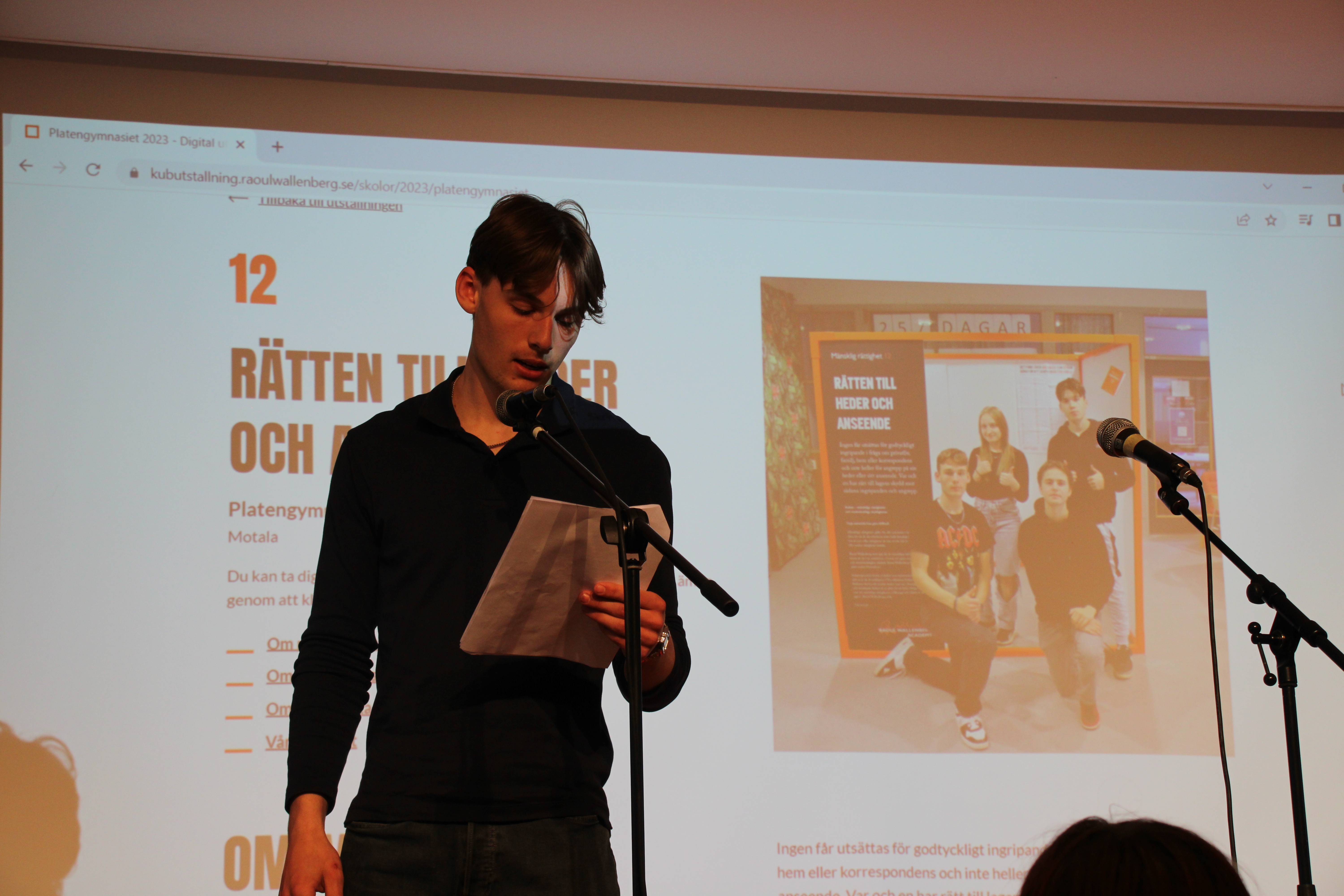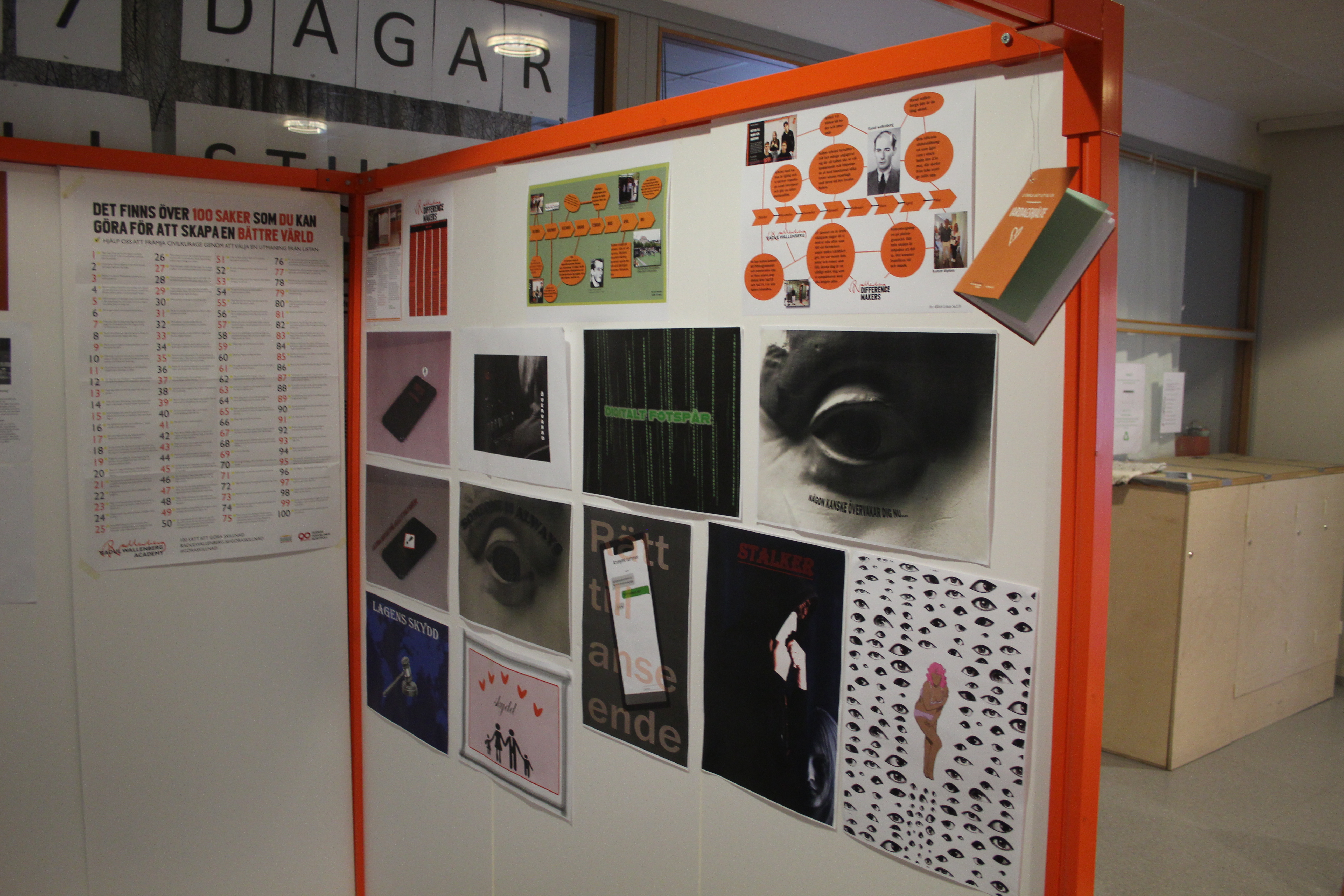 Årets projekt med kuben och artikel 12: (rätten till heder och anseende) kan beskrivas utifrån två perspektiv, heder och övervakningssamhället. Vi valde att fokusera mer på övervakning då hedersförtryck tagits upp i många andra sammanhang. Årets kub kretsar därför kring debattartiklar på temat övervakning samt grafiska bilder och texter som knyter an till temat. Arbetet med Kuben och artikel 12 har varit inspirerande och lett till ökad kunskap om mänskliga rättigheter och vad de kan innebära i praktiken. Utifrån artikel 12 har vi fördjupat oss i frågor som rör övervakningssamhället och lärt oss att det kan handla om alltifrån övervakning på internet och digitala fotspår till en diskussion kring kameror som brottsförebyggande åtgärd och ur ett integritetsperspektiv. Rätten till heder och anseende har även bidragit med ökad kunskap om hedersförtryck och inskränkningar i privatlivet. Under processens gång har vi även lärt oss att arbeta i projekt och hur man dokumenterar ett projekt. Arbetet har även inneburit samarbete mellan flera aktörer. Processen har letts av en mindre styrgrupp som varit drivande och sedan har fler elever producerat material på årets tema. Montering av den fysiska kuben, workshop och intervju med Tilda Sjögren som arbetar på RWA och planering och genomförande av kubeninvigning på skolan har gett oss lärdomar om såväl intervjuteknik, detaljplanering inför en dag samt att smycka och pynta kuben. Den 9 maj hölls en kubeninvigning på skolan där vi arbetade fram ett program i aulan och där årets Kub presenterades för alla elever i årskurs 2 på skolan samt inbjudna politiker, tjänstemän och näringsliv inom Motala kommun. Kubeninvigningen sammanföll även med EU-dagen, vilket medförde att vi även kunde koppla till EU denna dag. Parallellt med detta har vi även arbetat intensivt med att ta fram en informationsfilm om kuben. I filmen finns material från monteringen av kuben, intervjumaterial med Tilda Sjögren samt filmmaterial från invigningen. Denna ska bifogas slututställningen och kommer även visas på mentorstid på skolan. (Se bifogad länk). Sammanfattningsvis har kubprogrammet lett till en ökad kunskap om mänskliga rättigheter i allmänhet och om heder och anseende i synnerhet. Att få arbeta praktiskt och driva ett projekt av denna dignitet har givit oss många lärdomar inför framtiden.