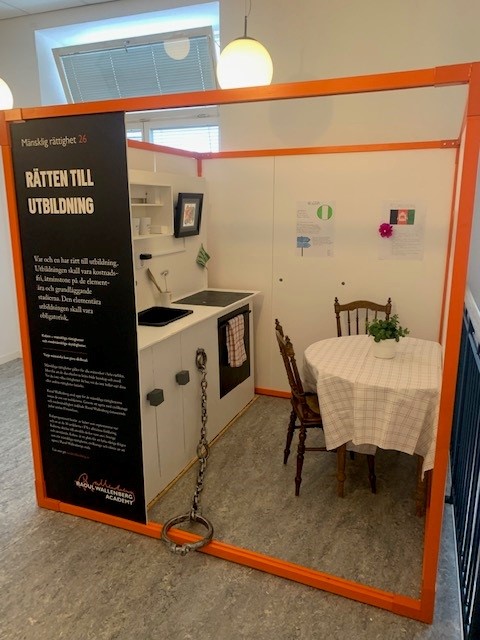 Vi har jobbat med Rätten till Utbildning. Nedanför är korta bildbeskrivningar på vår utställning: - Föreläsning kuben – Skolan får besök av Tilde från Kubprogrammet. Besöket satte igång elevernas tankeprocess inför utformandet av kuben. - Halvfärdig kub – Efter besöket från Tilde skapades en projektgrupp på skolan. Projektgruppen bestämde sig tidigt för att de ville uppmärksamma de flickor runt om i världen som av olika anledningar inte har rätt till utbildning. Efter lite diskussioner beslutade sig projektgruppen för att de ville bygga ett kök som skulle få symbolisera problemet med att kvinnor historiskt, men även idag, tvingas ta hand om hemmet istället för att utbilda sig. På bilden ser ni köket under uppbyggnadsprocessen. - Färdig kub – Skolans bygg- och målerielever fick lägga händerna på kuben – och voila – ett kök står på plats. Kubens ”pricken över i” blev en kedja som skulle hjälpa att föra fram budskapet om att kvinnor blir tvingade till att ta hand om hemmet. - Invigning – När kuben väl var klar invigdes den av skolans ettor. - Rektor håller tal – Rektorn höll ett tal om vikten av att alla flickor får gå i skolan. - Projektgruppen kuben – Här är projektgruppen som arbetat med att utforma kuben!