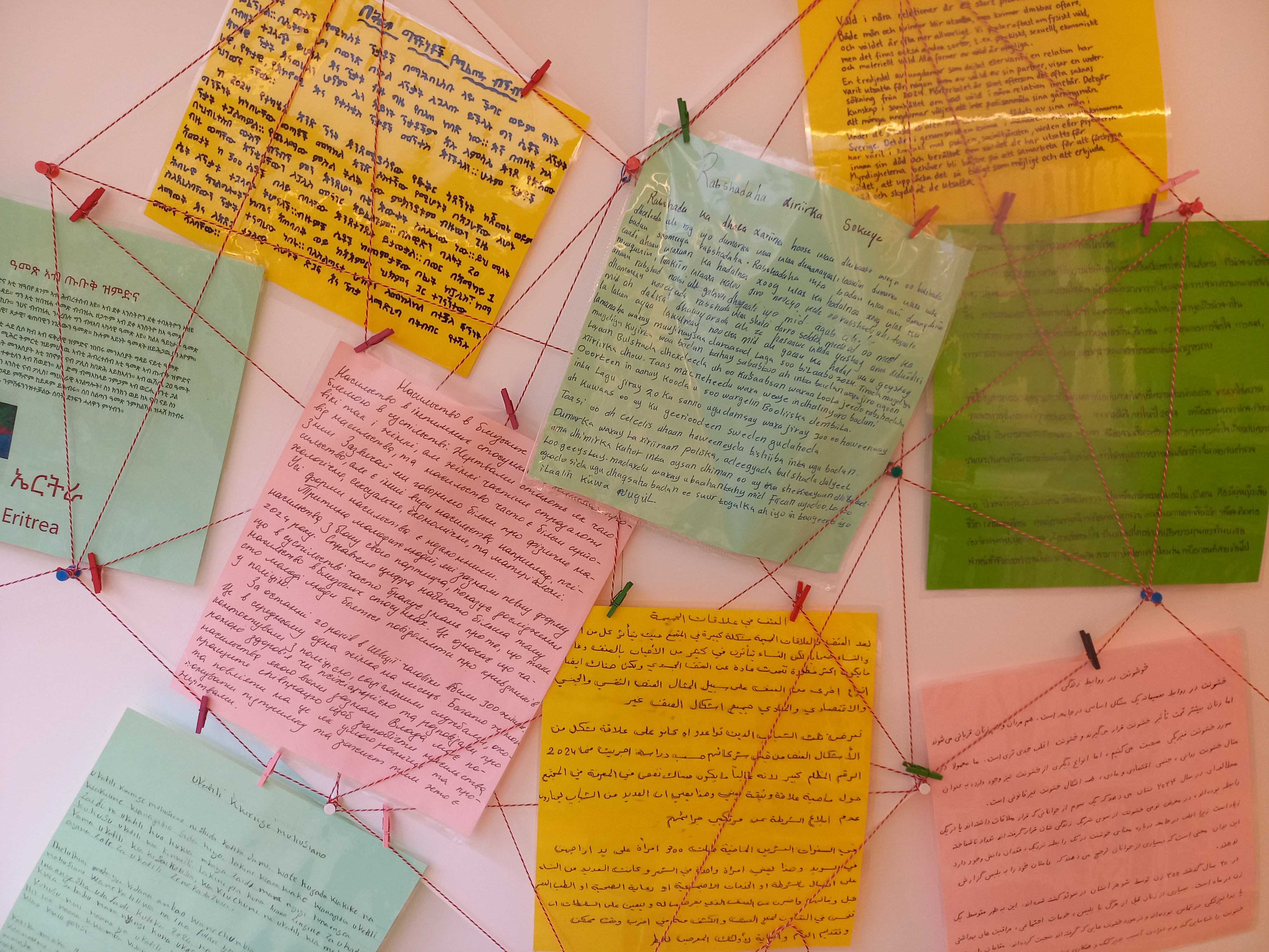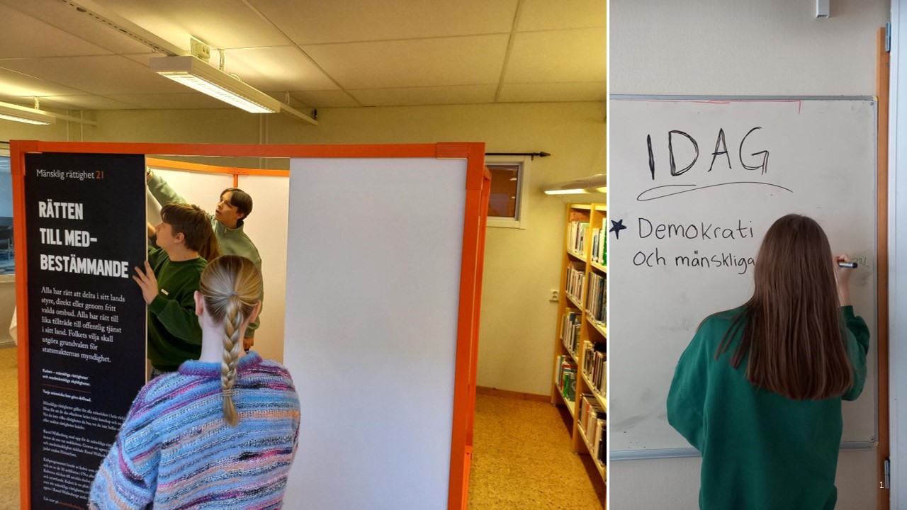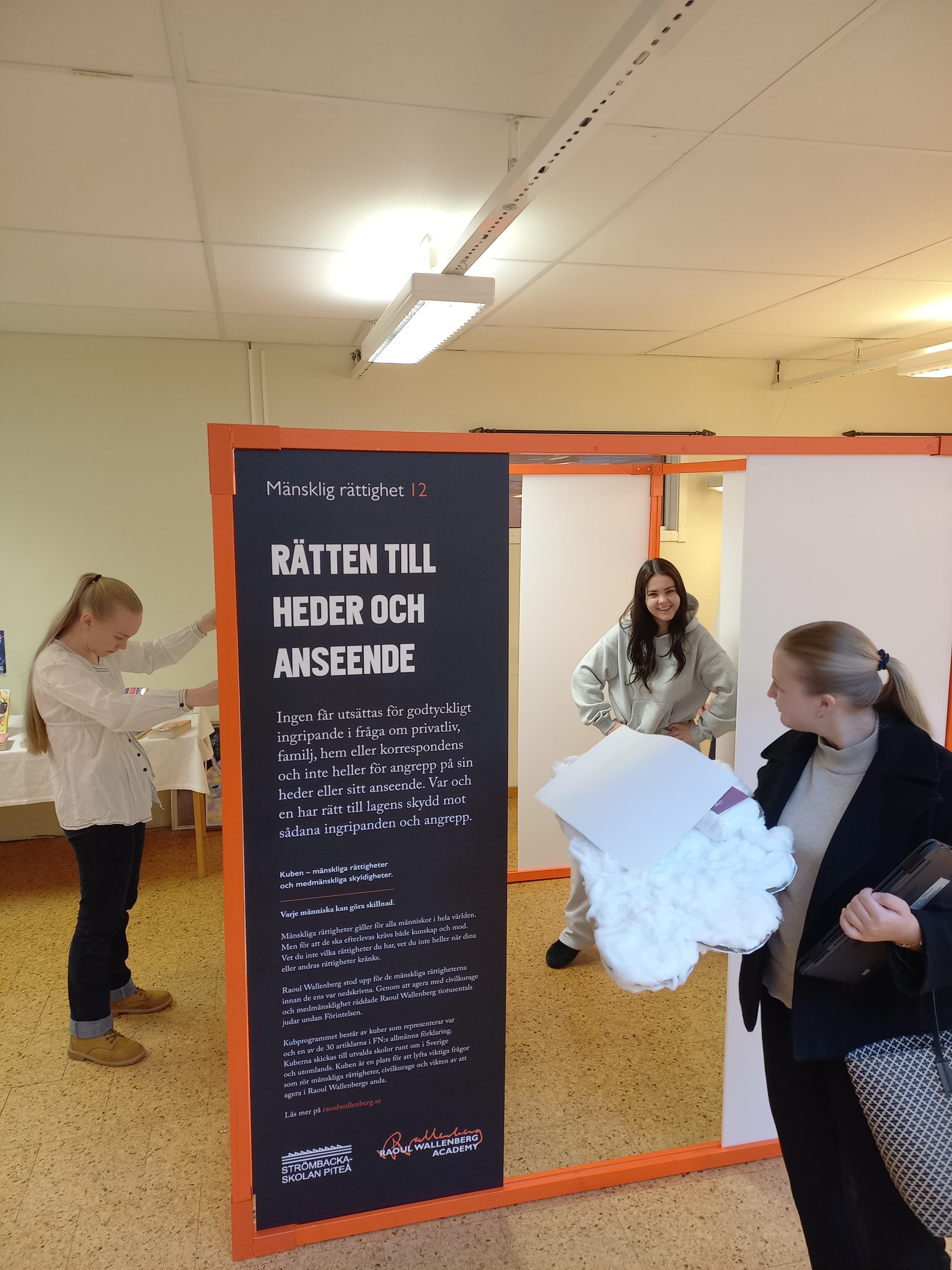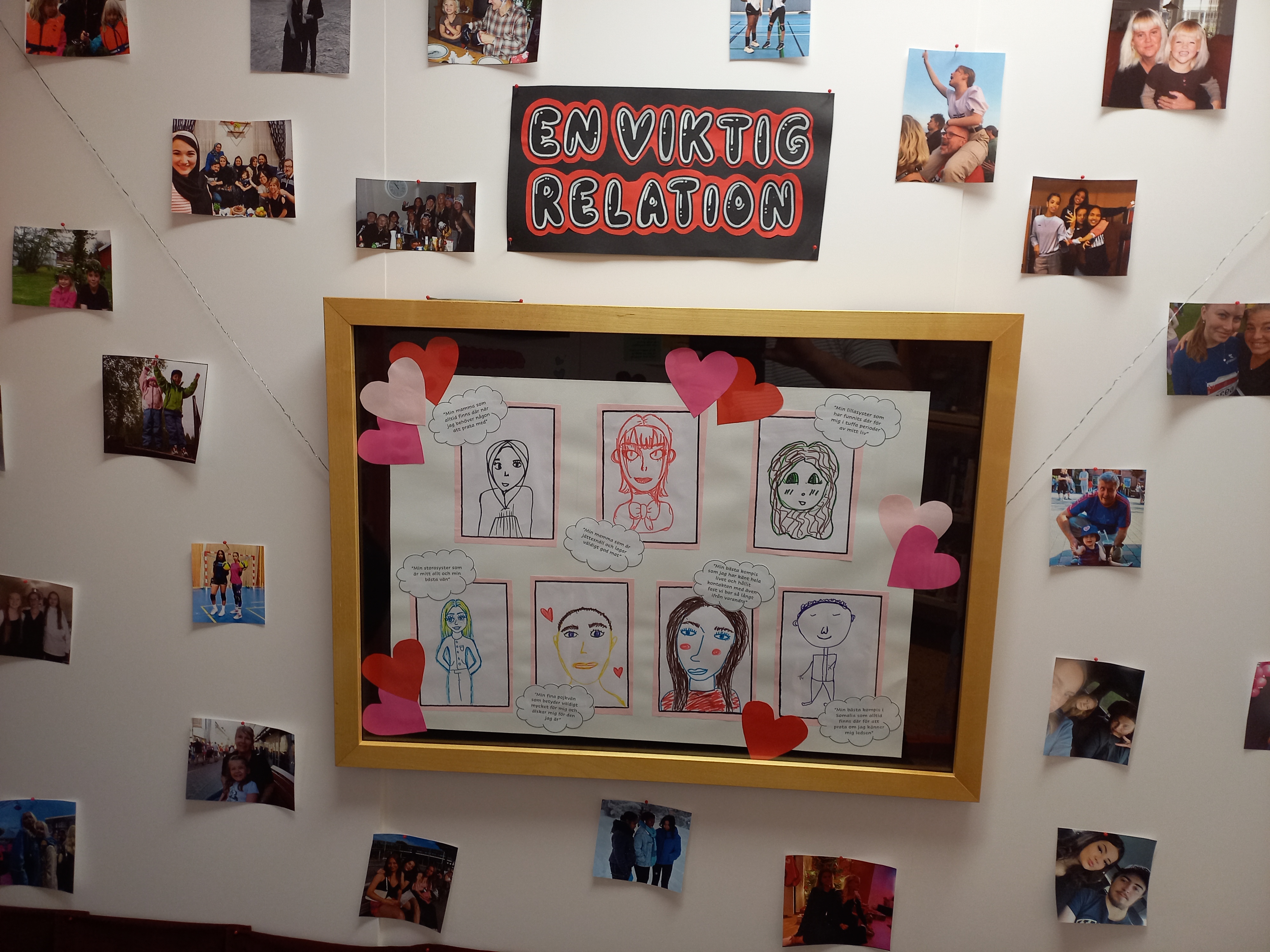 Samhällsprogrammet har tillsammans med språkintroduktion arbetat med artikel 12, Rätten till heder och anseende. Vi resonerade tidigt att vi inte bara ville informera om mänskliga rättigheter, utan också praktisera dem. Därför startade vi ett projekt angående relationer. Tillsammans har vi haft fyra träffar där vi har kunnat mötas och diskutera om olika typer av relationer och kulturyttringar. Där alla tillåts komma till tals och få ventilera tankar och funderingar kring relationer, samtidigt som vi bygger nya! Det gemensamma materialet och diskussionerna samlade vi ihop till en utställning om relationer. Utställningen behandlade ämnen så som bra och dåliga relationer. Vad är en bra vänskap? Toxic-relationer, hur hanteras dessa? Via utställningen kunde alla som funderat finna kunskap om sunda och osunda relationer. Därigenom hur artikel 12 bäst uppfylls. Under invigningen av utställningen hölls tal, och därefter begav sig alla till en guidad tur genom utställningen.