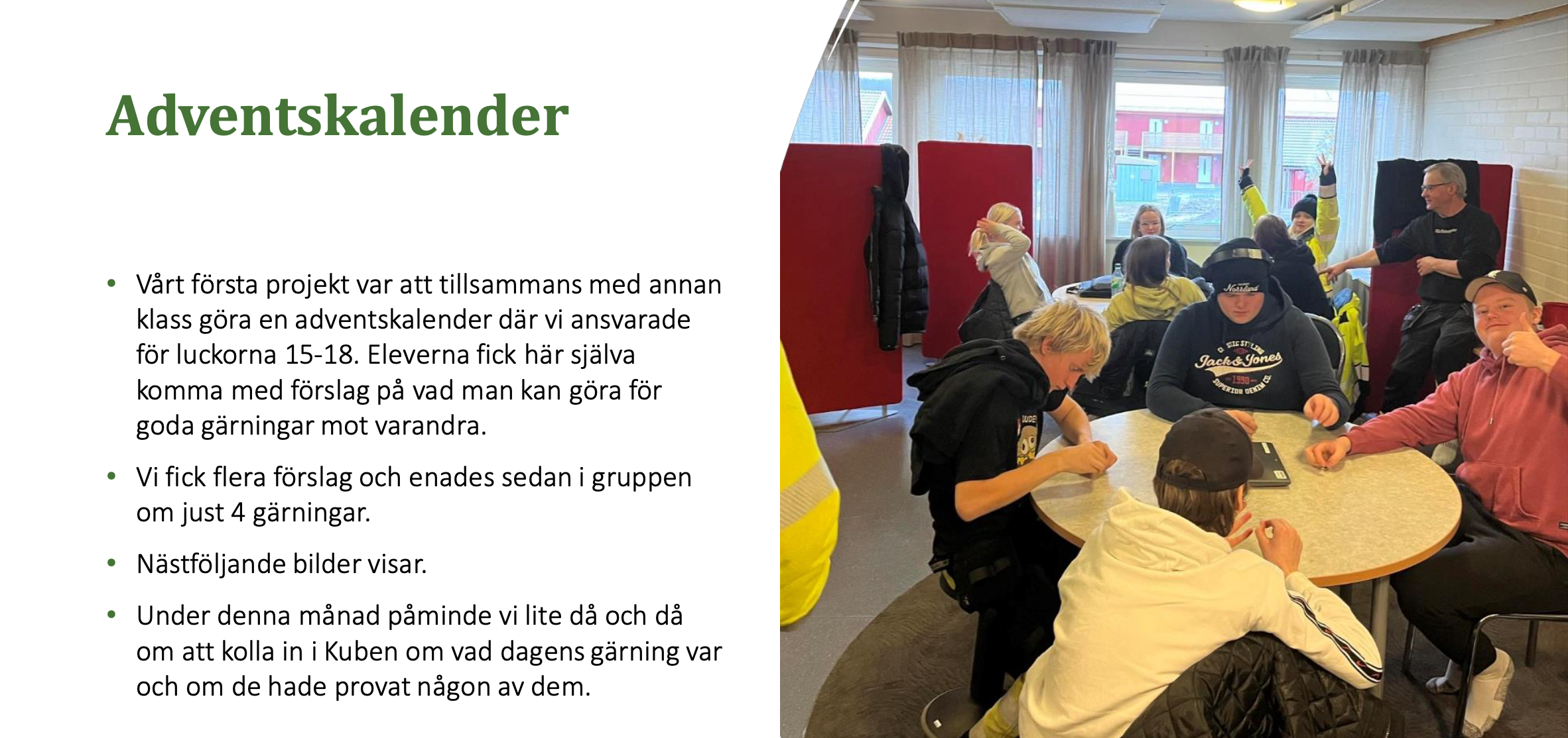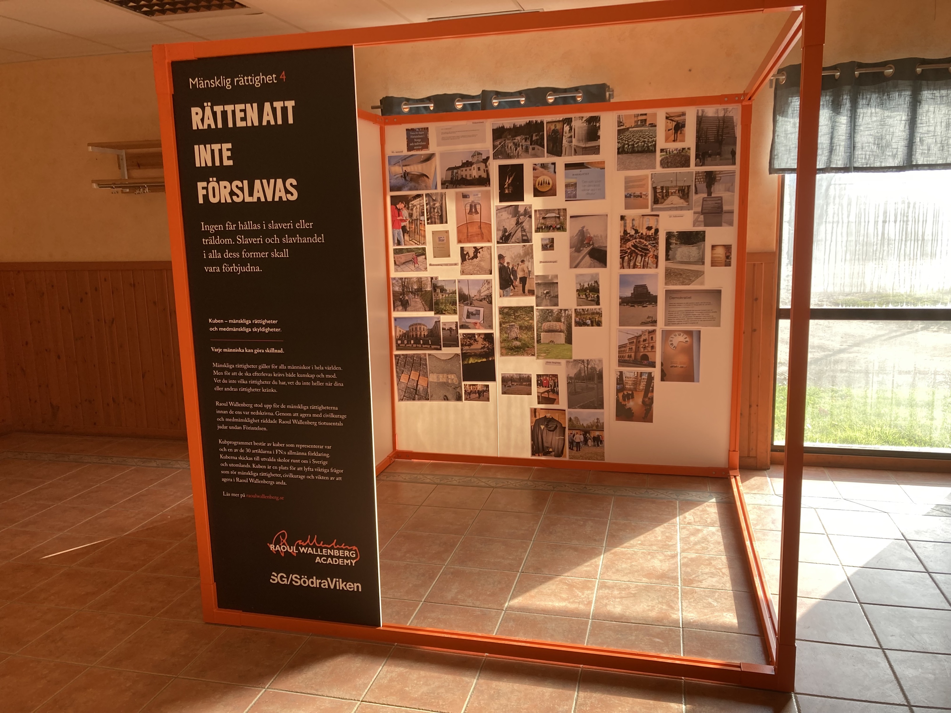Starten av Kuben projektet skedde i september med startenkät, sen monterades Kuben av eleverna på anpassad. Skolans årskurser fick ansvara för varsin månad, utom januari då montern fylldes med utställningsmaterial från Forum för levande historia i samband med förintelsens minnesdag. Planeringsgruppen bestod av representanter från de olika lärarlagen och respresentanter från elevhälsan som tog det vidare till de olika arbetslagen och ut i klasserna. Tolkning av vår tilldelade rättighet MR nr 4 och närliggande teman har sett olika ut och tolkats utifrån olika infallsvinklar så innehåll av aktiviteter har sett lite olika ut i de olika klasserna. Projektets fokus på vardagliga diskussioner och reflektioner om civilkurage och slaveri anses vara det viktigaste. Att stanna upp och reflektera över dessa frågor är avgörande för att elever ska kunna utvecklas till ansvarsfulla och demokratiska medborgare. Skolan har en viktig roll i att ge eleverna verktyg och inspiration att ta ställning mot orättvisor och engagera sig i frågor som rör mänskliga rättigheter. Arbetet var både informativt och utmanande för eleverna. Det var värdefullt att få diskutera viktiga frågor som yttrandefrihet och mänskliga rättigheter. Eleverna visade stort engagemang och kreativitet i sina uppgifter.