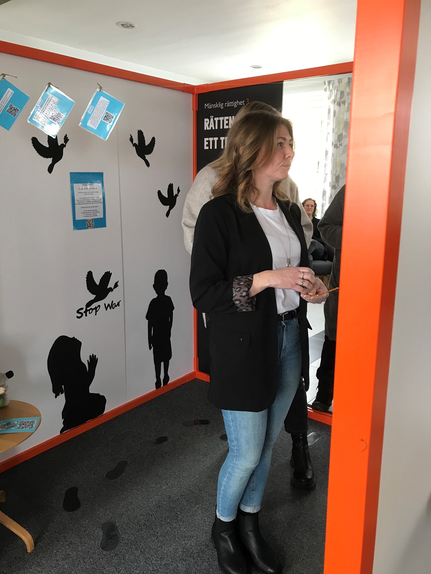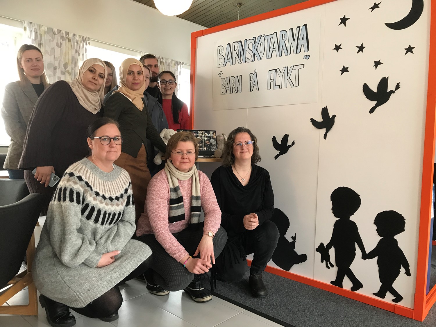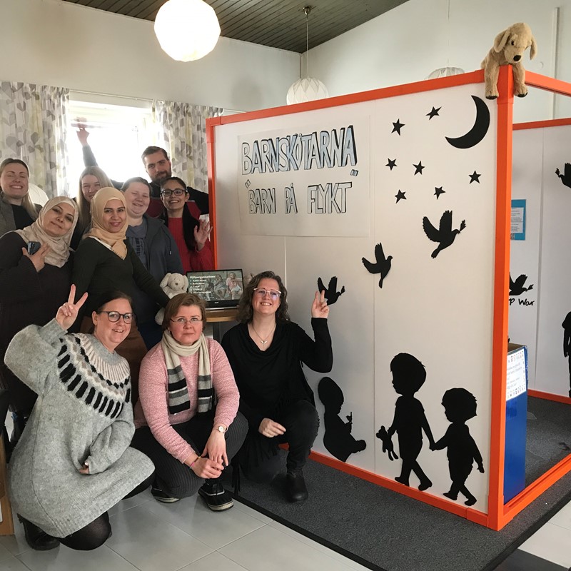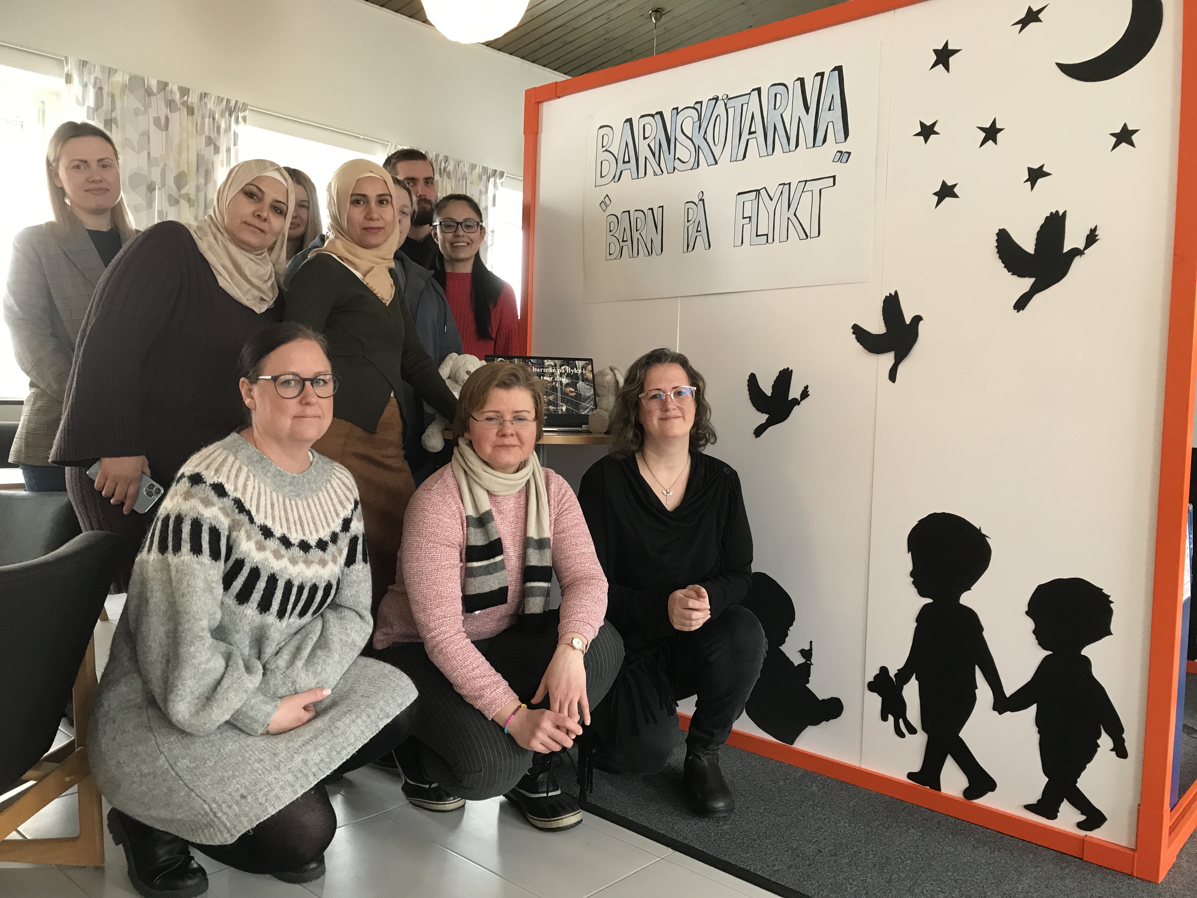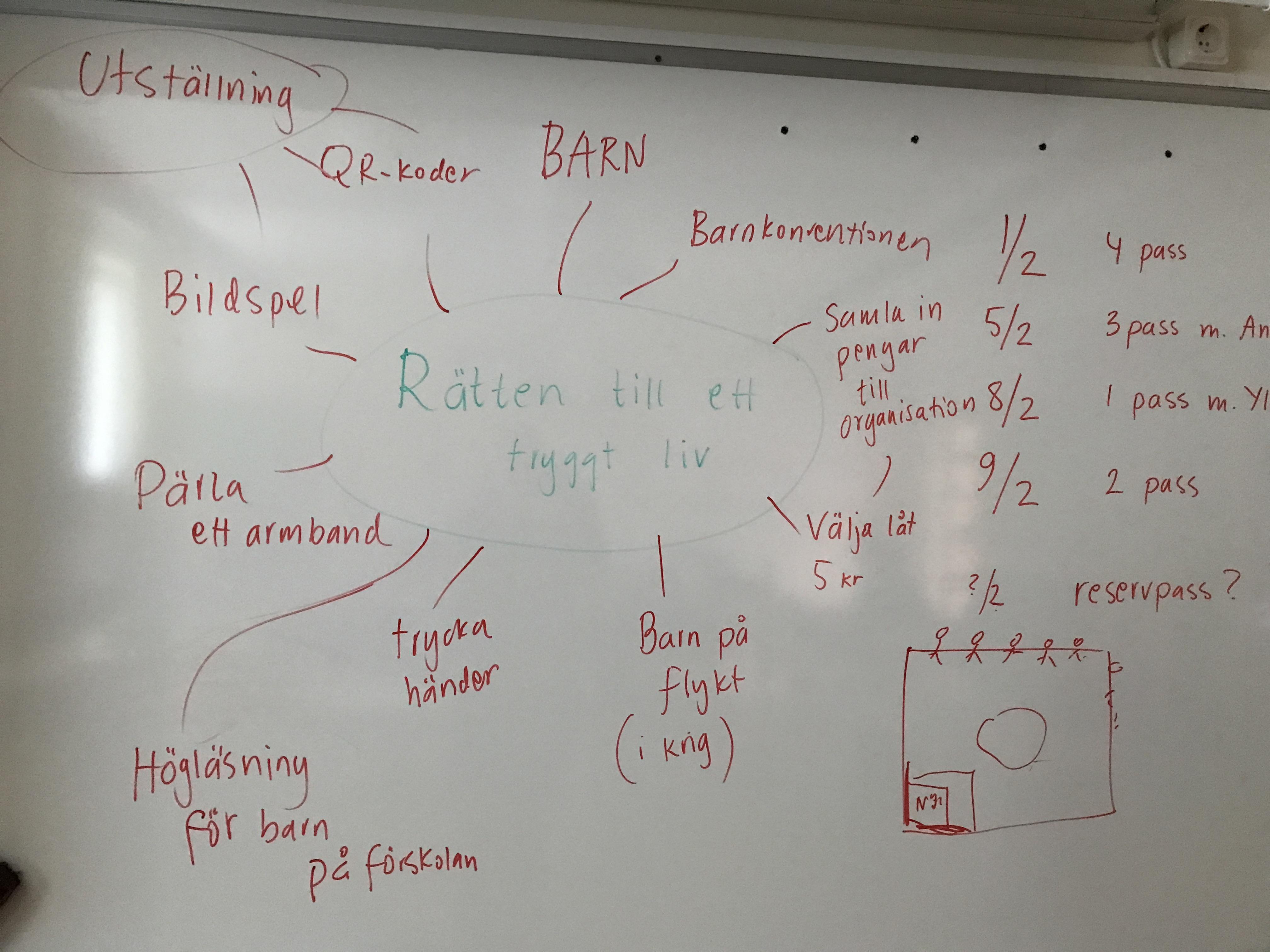 "Rätten till ett tryggt liv" - Idén om "Barn på flykt" kom ganska snabbt och lätt till oss. Med tanke på vad som händer i världen just nu och att vi i framtiden ska jobba med barn så var valet av tema självklart på något sätt. Vi började med att göra en tankekarta om vilken information vi ville ha med och hur vi ville presentera vårt arbete för ögat. Vårt mål var att få människor berörda genom att se vår utställning och att väcka engagemang och vilja lära sig mer om hur det kan vara att vara ett barn på flykt. Utställningen bestod av information på både kubens väggar och ett bildspel på en padda, svarta siluetter på barn pryder väggarna och en insamling för kläder och leksaker till flyktingfamiljer som kommer till Vimmerby kommun fanns i KUBEN så att alla som går på skolan kunde lämna in det de ville skänka under tre veckor när utställningen var öppen. Vi kunde aldrig anat hur mycket vi skulle få in... Simon Lundberg och Anton Palmer från kommunen kom med en minibuss för att få in alla saker och kläder som vi fått. De gick direkt till nya familjer i Vimmerby som nyss kommit som flyktingar. Och vad vi har hört så har det mesta gått åt! Vi är väldigt tacksamma för den respons vi fått på vårt KUBEN-projekt "Barn på flykt" i form av gåvor men också för allt vi själva har lärt oss om detta tema. Vi känner oss tacksamma att leva i ett demokratiskt och tryggt land i fred nu när vi vet hur det kan vara för de 110 miljoner i världen som tvingats lämna sina hem, nära och kära, sitt land. I samband med utställningen har vi fördjupat oss i: - Några konflikter som pågår i världen idag - Hur en flyktväg kan se ut, vad som kan hända på vägen och hur lång tid det kan ta att komma fram till en säker plats/land - Hur en asylprocess går till - Vad som händer när du fått asyl i Sverige (rättigheter och skyldigheter och ekonomi) - Vilka länder som tar emot flest flyktingar och hur många Sverige tar emot årligen - Hur ett barn påverkas av upplevelser av krig och att vara på flykt (trauma och PTSD) - Hur vi som framtida barnskötare kan upptäcka och vara stöd för barn som har varit på flykt eller har traumatiska upplevelser