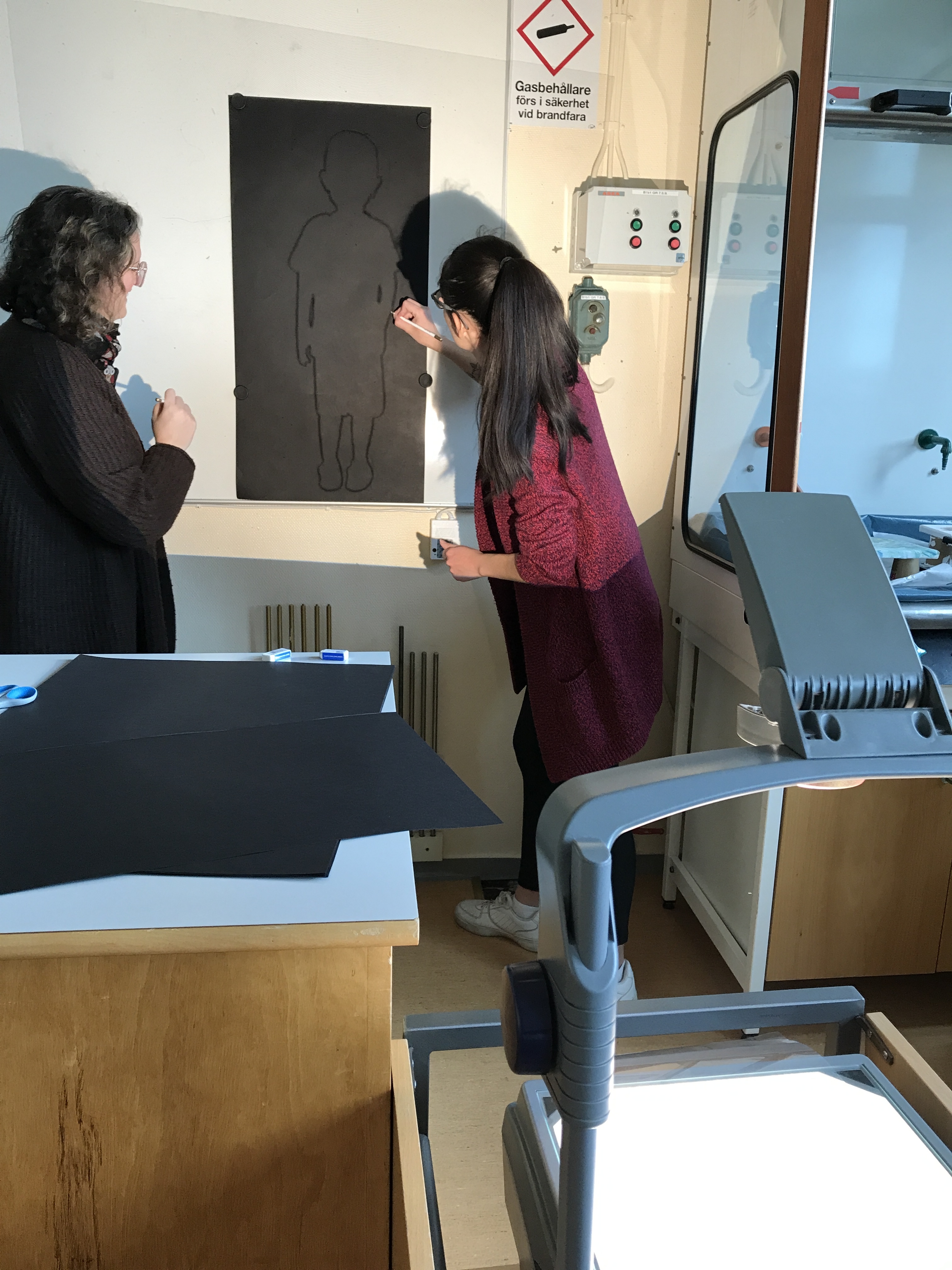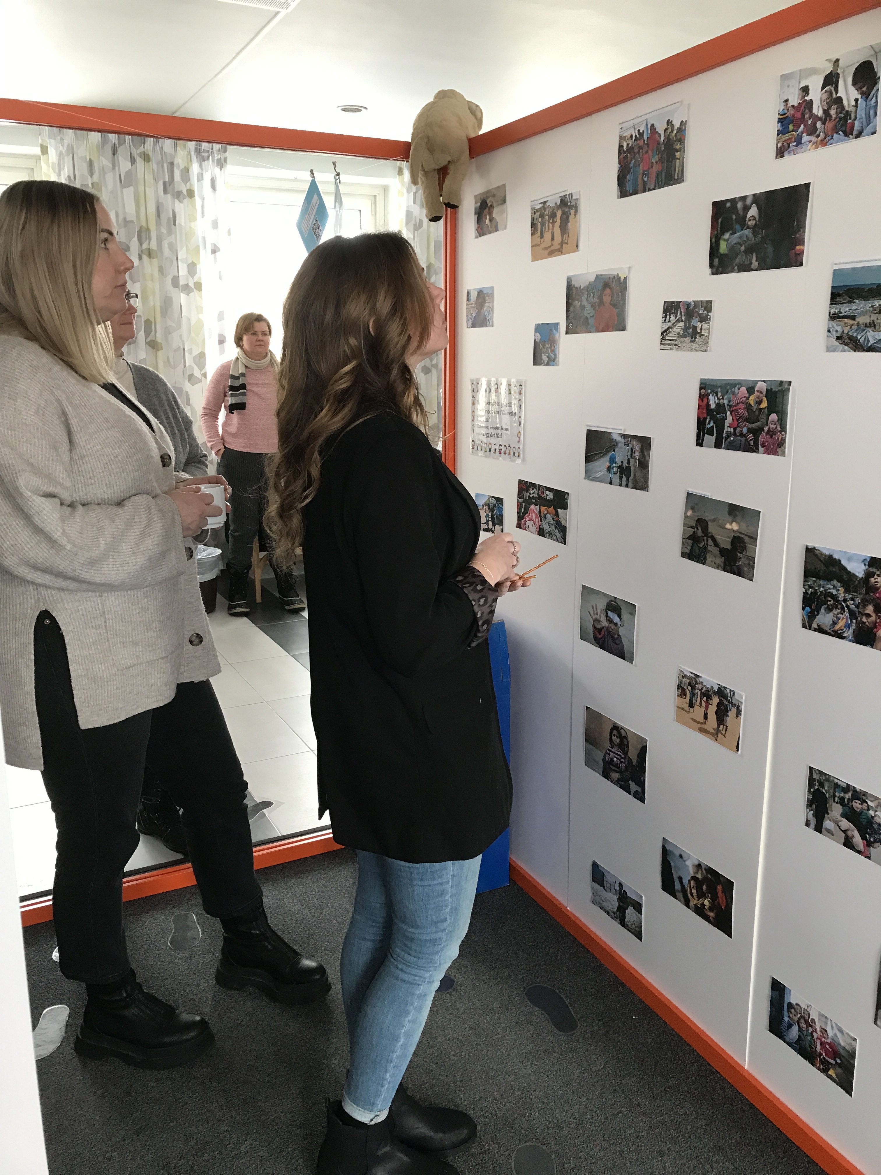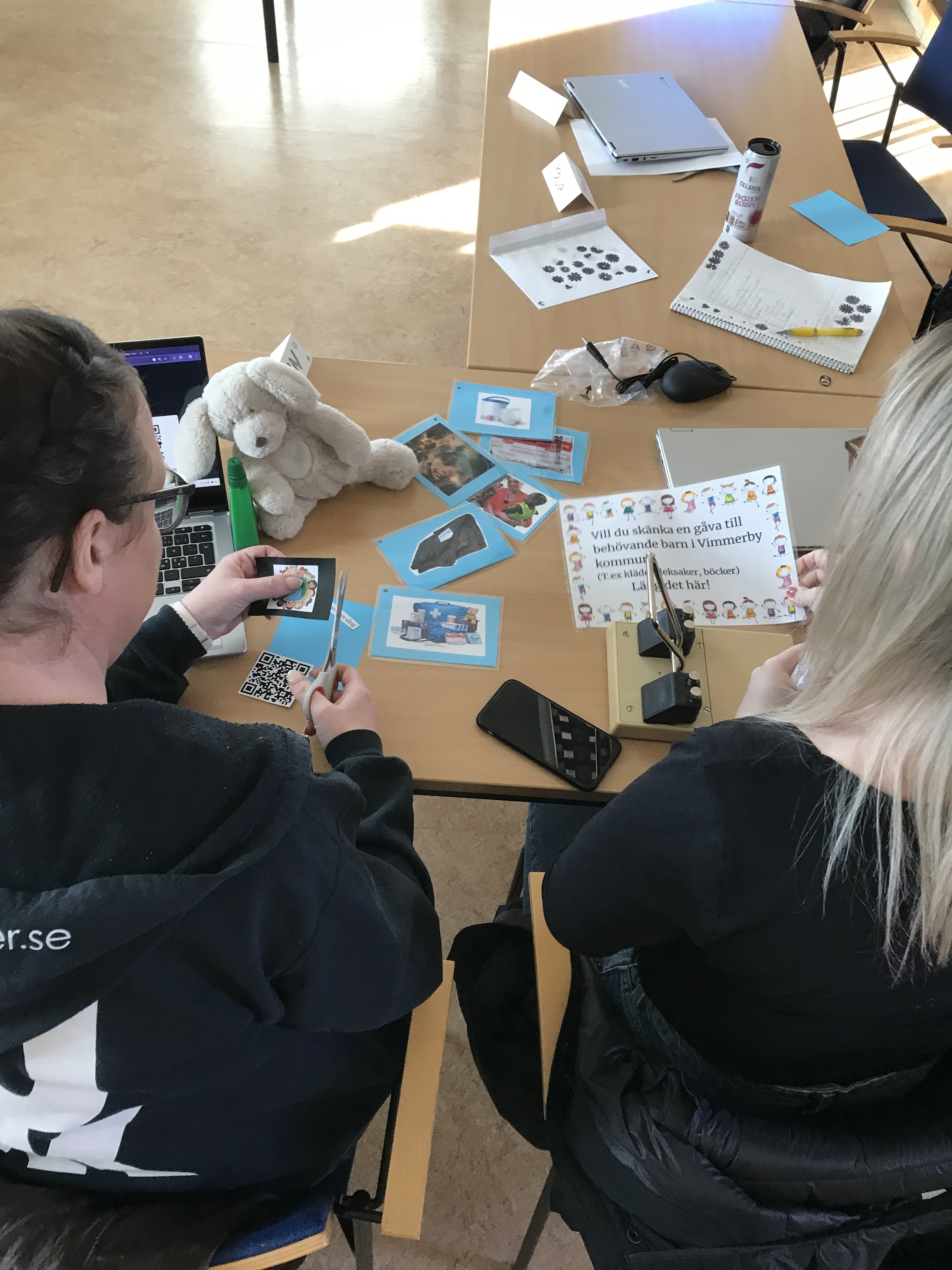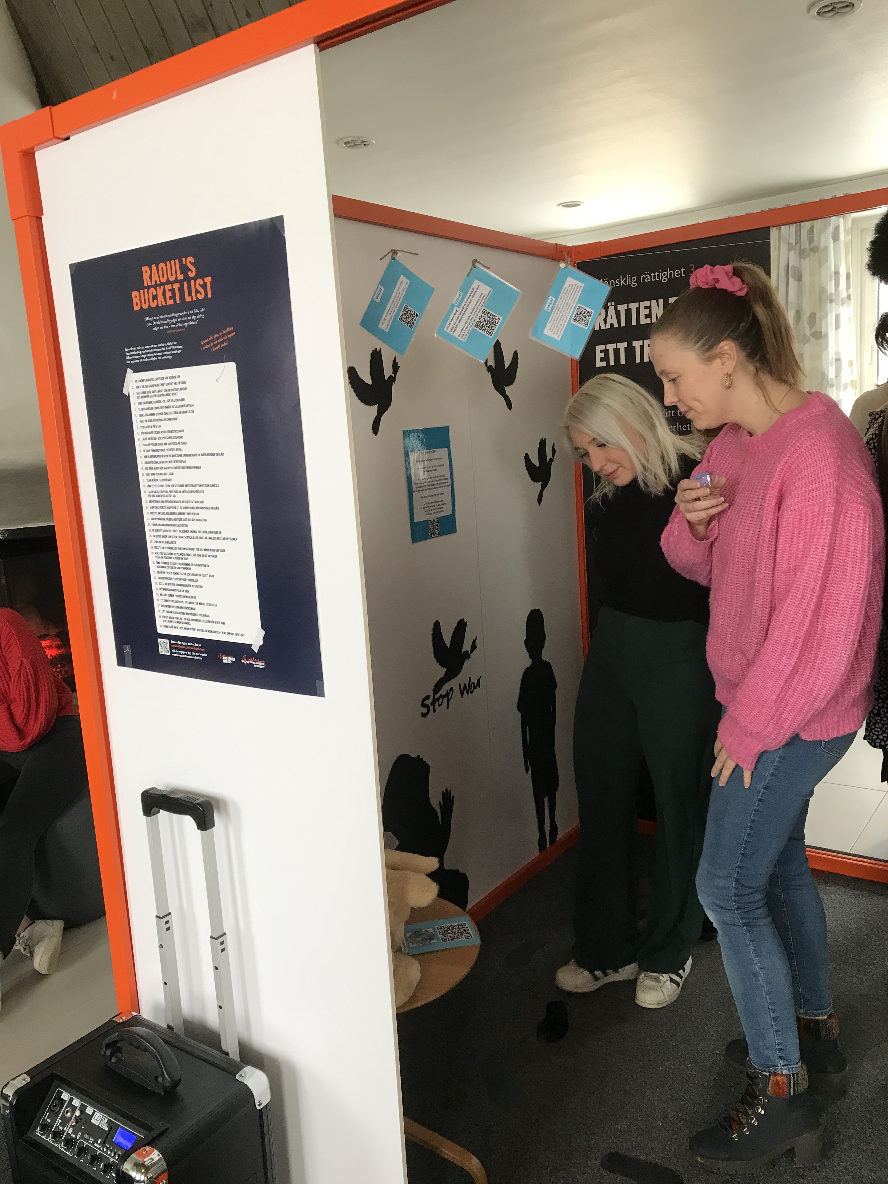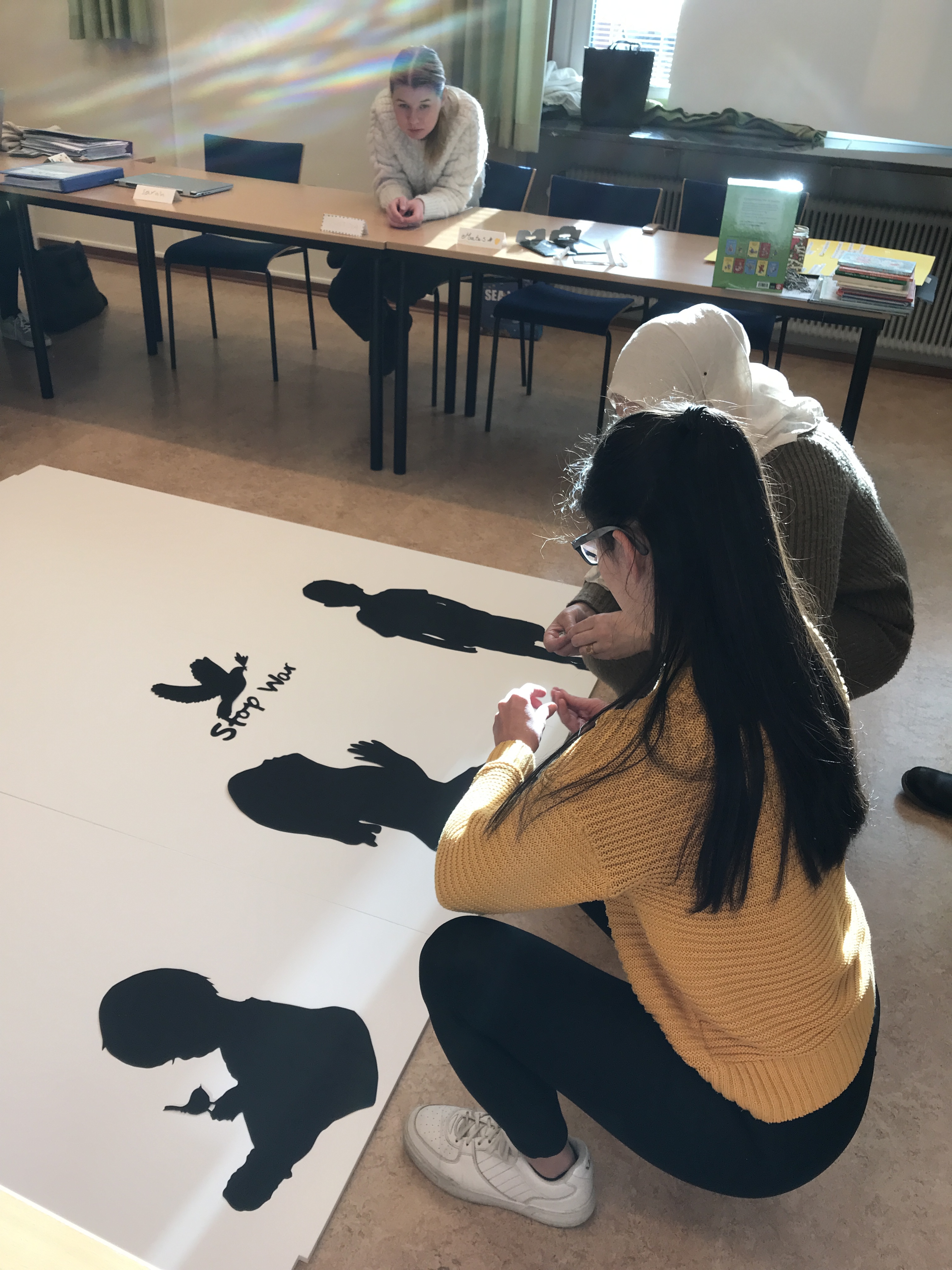 "Rätten till ett tryggt liv" - Idén om "Barn på flykt" kom ganska snabbt och lätt till oss. Med tanke på vad som händer i världen just nu och att vi i framtiden ska jobba med barn så var valet av tema självklart på något sätt. Vi började med att göra en tankekarta om vilken information vi ville ha med och hur vi ville presentera vårt arbete för ögat. Vårt mål var att få människor berörda genom att se vår utställning och att väcka engagemang och vilja lära sig mer om hur det kan vara att vara ett barn på flykt. Utställningen bestod av information på både kubens väggar och ett bildspel på en padda, svarta siluetter på barn pryder väggarna och en insamling för kläder och leksaker till flyktingfamiljer som kommer till Vimmerby kommun fanns i KUBEN så att alla som går på skolan kunde lämna in det de ville skänka under tre veckor när utställningen var öppen. Vi kunde aldrig anat hur mycket vi skulle få in... Simon Lundberg och Anton Palmer från kommunen kom med en minibuss för att få in alla saker och kläder som vi fått. De gick direkt till nya familjer i Vimmerby som nyss kommit som flyktingar. Och vad vi har hört så har det mesta gått åt! Vi är väldigt tacksamma för den respons vi fått på vårt KUBEN-projekt "Barn på flykt" i form av gåvor men också för allt vi själva har lärt oss om detta tema. Vi känner oss tacksamma att leva i ett demokratiskt och tryggt land i fred nu när vi vet hur det kan vara för de 110 miljoner i världen som tvingats lämna sina hem, nära och kära, sitt land. I samband med utställningen har vi fördjupat oss i: - Några konflikter som pågår i världen idag - Hur en flyktväg kan se ut, vad som kan hända på vägen och hur lång tid det kan ta att komma fram till en säker plats/land - Hur en asylprocess går till - Vad som händer när du fått asyl i Sverige (rättigheter och skyldigheter och ekonomi) - Vilka länder som tar emot flest flyktingar och hur många Sverige tar emot årligen - Hur ett barn påverkas av upplevelser av krig och att vara på flykt (trauma och PTSD) - Hur vi som framtida barnskötare kan upptäcka och vara stöd för barn som har varit på flykt eller har traumatiska upplevelser