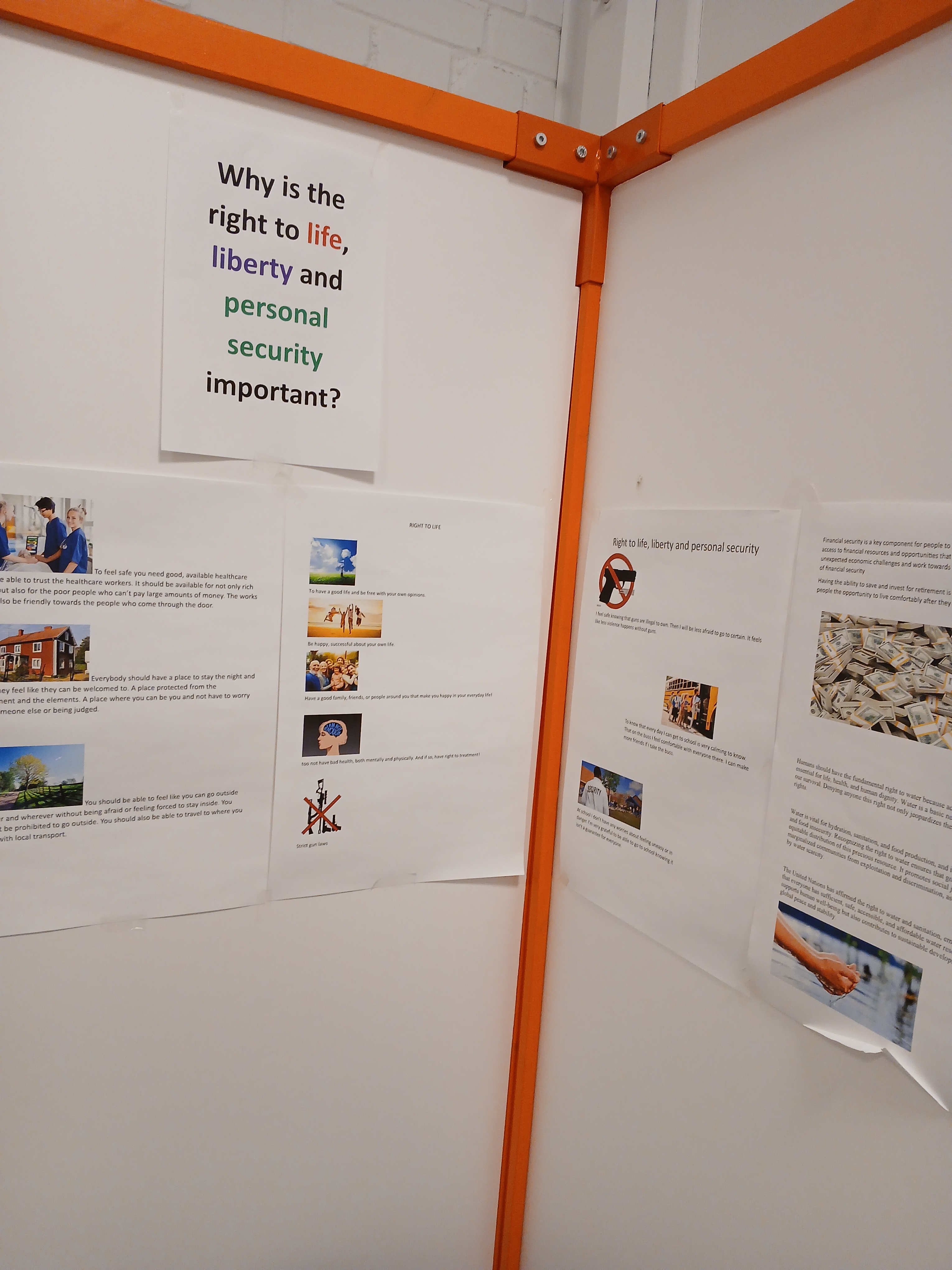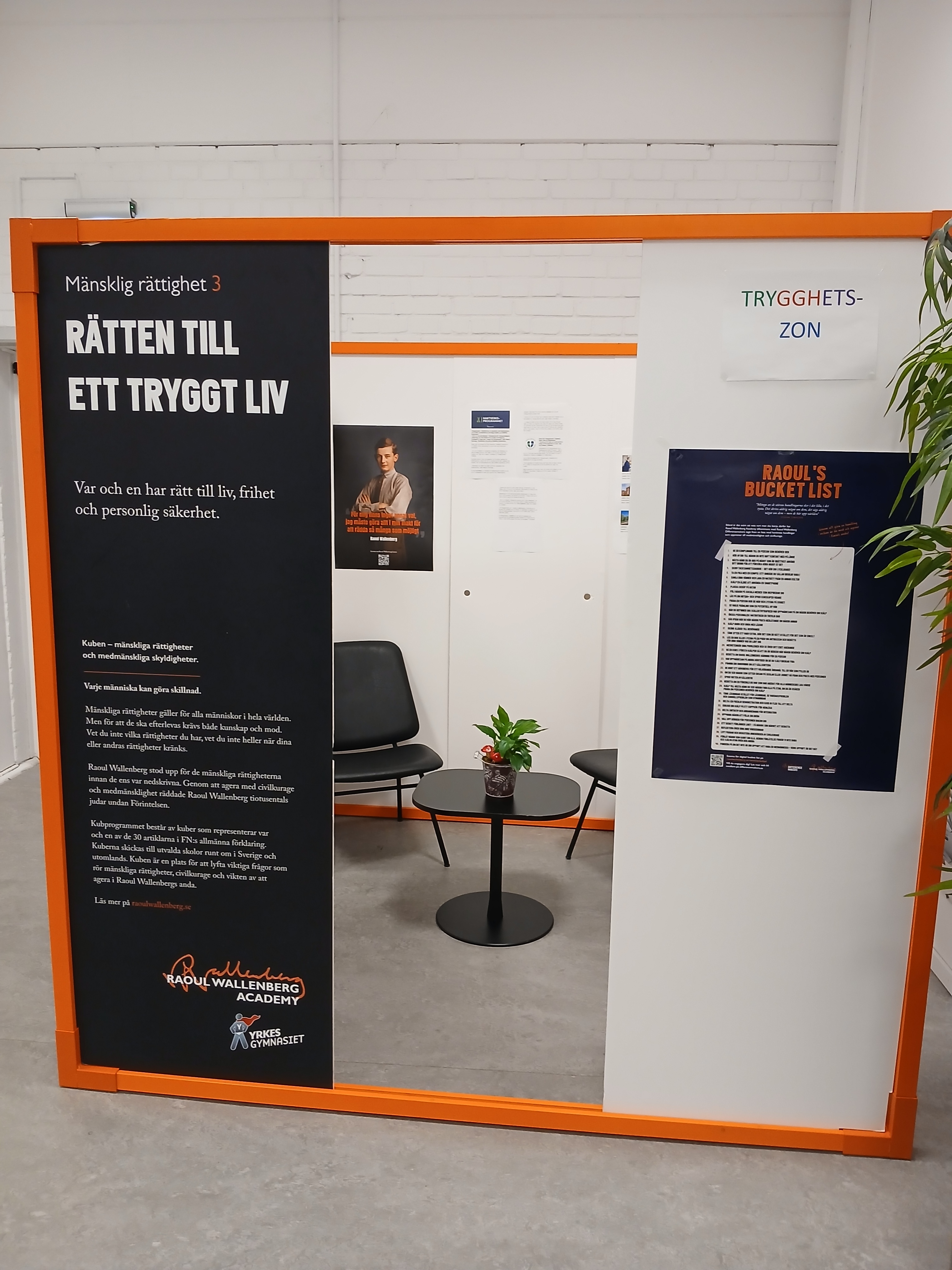 I vårt arbete kring 'rätten till ett tryggt liv' låg fokus på att utforska och förstå de olika dimensionerna av trygghet. Eleverna engagerade sig i djupgående diskussioner kring hur trygghet inte bara handlar om frånvaro av fara, utan också om att skapa en miljö där individer känner sig mentalt, fysiskt och känslomässigt skyddade och respekterade. En utmaning vi stötte på var hur upplevelse av trygghet och hur den kan variera beroende på individens bakgrund, erfarenheter och kulturella bakgrund. Genom att analysera olika perspektiv och lyfta fram gemensamma värden kunde vi fördjupa vår förståelse för vad som krävs för att främja en känsla av trygghet i samhället. Ett konkret exempel på hur vi har arbetat med trygghet i samhället är att våra kub-representanter har fått möjlighet att vara med och påverka hur det nya resecentrumet ska vara utformat – i relation till trygghet.