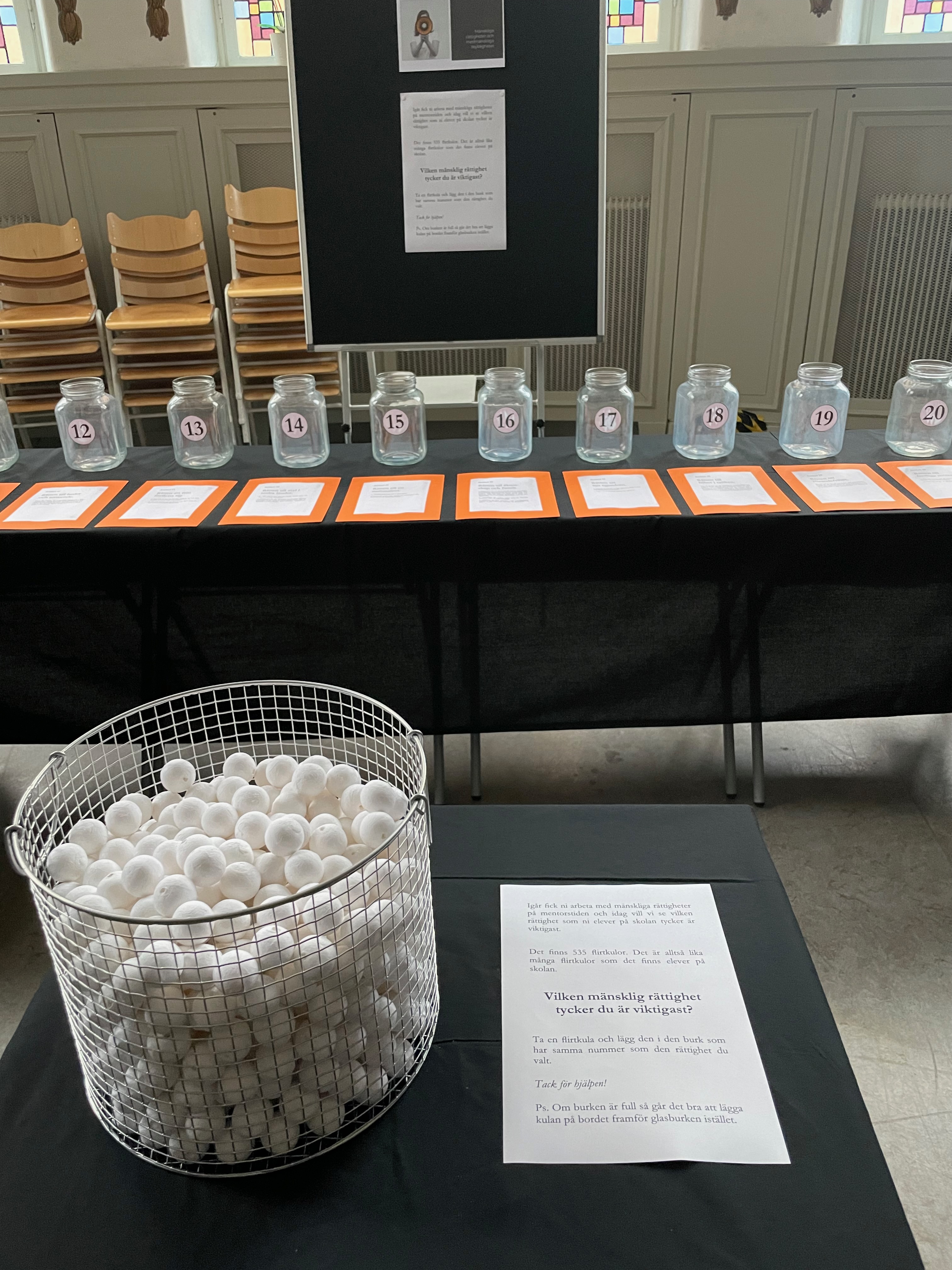 Under torsdagens mentorstid fick samtliga klasser på skolan arbeta med mänskliga rättigheter med hjälp av övning 1.1 i det digitala verktyget: Vad är mänskliga rättigheter. Det blev många fina diskussioner i klassrummen och eleverna fick även skriva ner sina val och motiveringar på papper. Dagen efter var det dags för vår första kubdag på skolan och en aktivitet där vi ville visualisera vilken rättighet som eleverna på vår skola tycker är allra viktigast. Vi bad eleverna gå förbi aulan under dagen och göra sin röst hörd. I aulan fanns det 535 bollar, en boll för varje elev på skolan. Eleverna fick ta en boll var och lägga den i den glasburk som representerade den rättighet de tyckte var viktigast. Totalt var nästan 75 % av eleverna som var på skolan den dagen med och röstade. De rättigheter som våra elever tyckte var viktigast var: Artikel 30 - Rätten till de mänskliga rättigheterna Artikel 1 - Rätten till frihet Artikel 3 - Rätten till ett tryggt liv Det bästa med dagen var samtalet eleverna emellan. Runt om i skolan, inte bara i aulan utan överallt, i matsalen, i trapphuset och i korridorerna hördes eleverna prata om de mänskliga rättigheterna. En del elever kom tillbaka till aulan flera gånger under dagen för att se efter hur de andra eleverna hade röstat. En ganska enkelt ordnad, men mycket lyckad aktivitet som engagerade hela skolan.