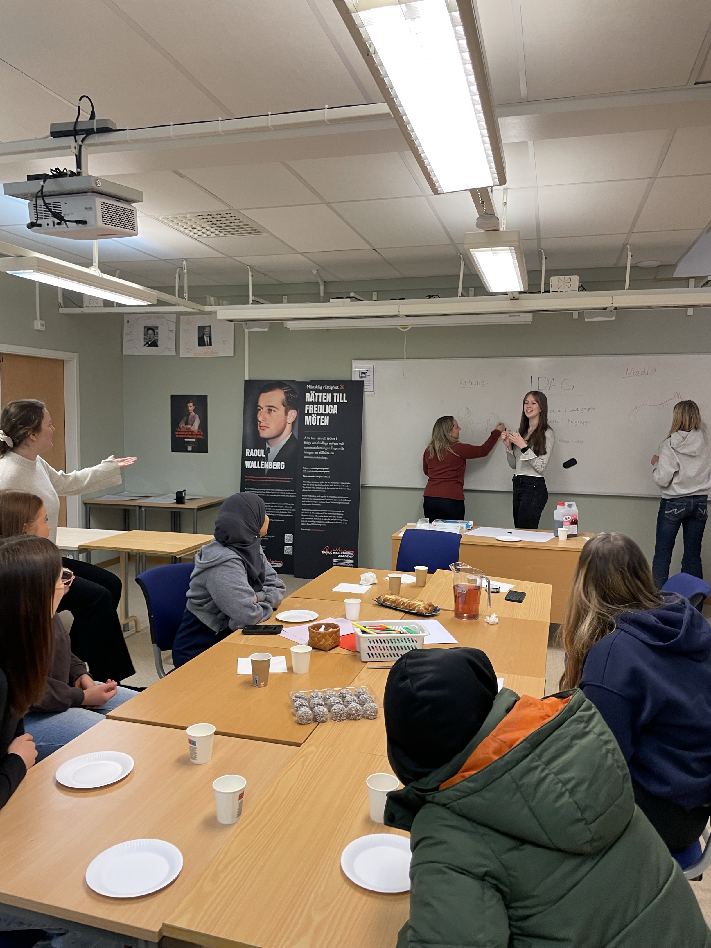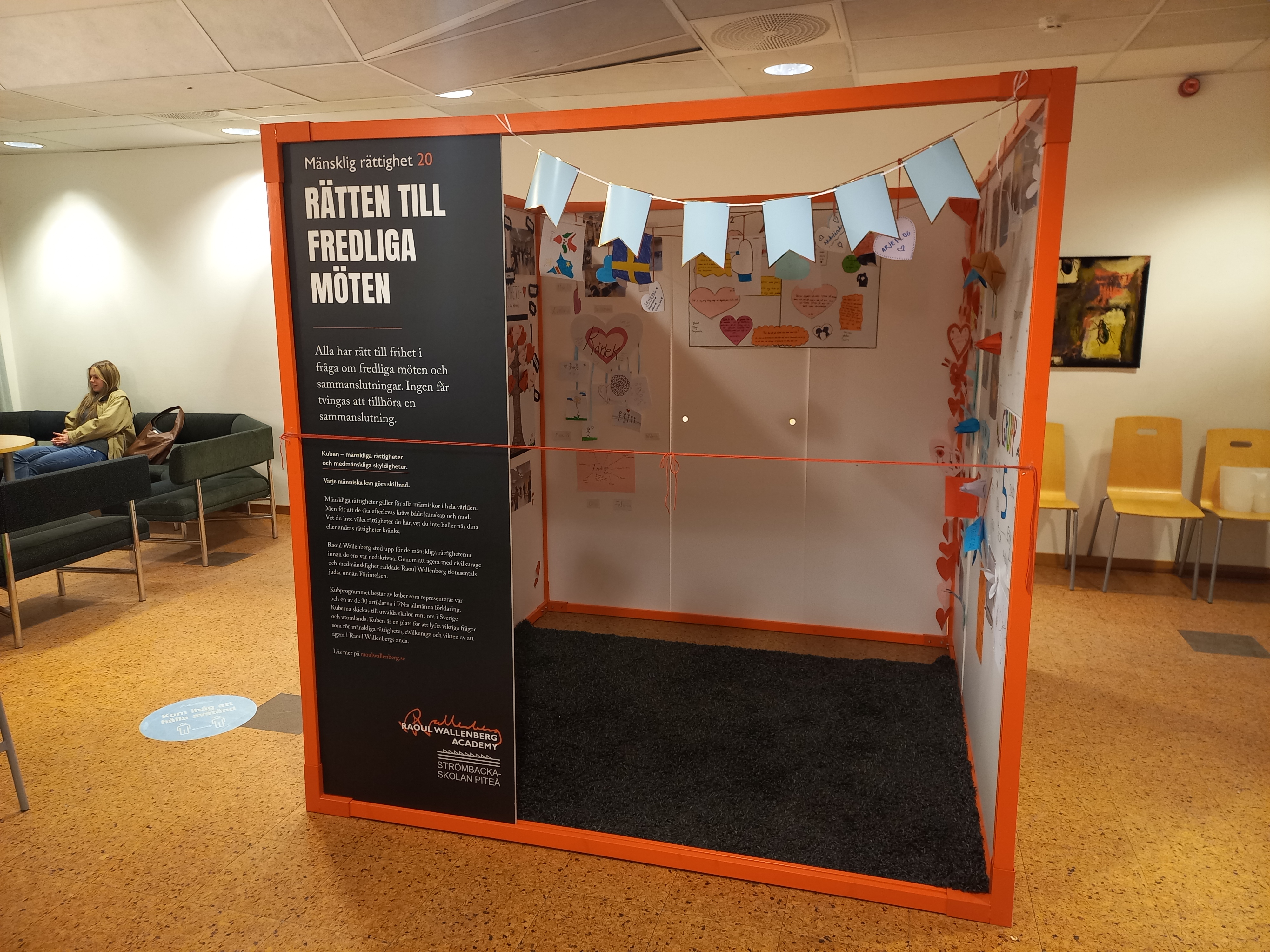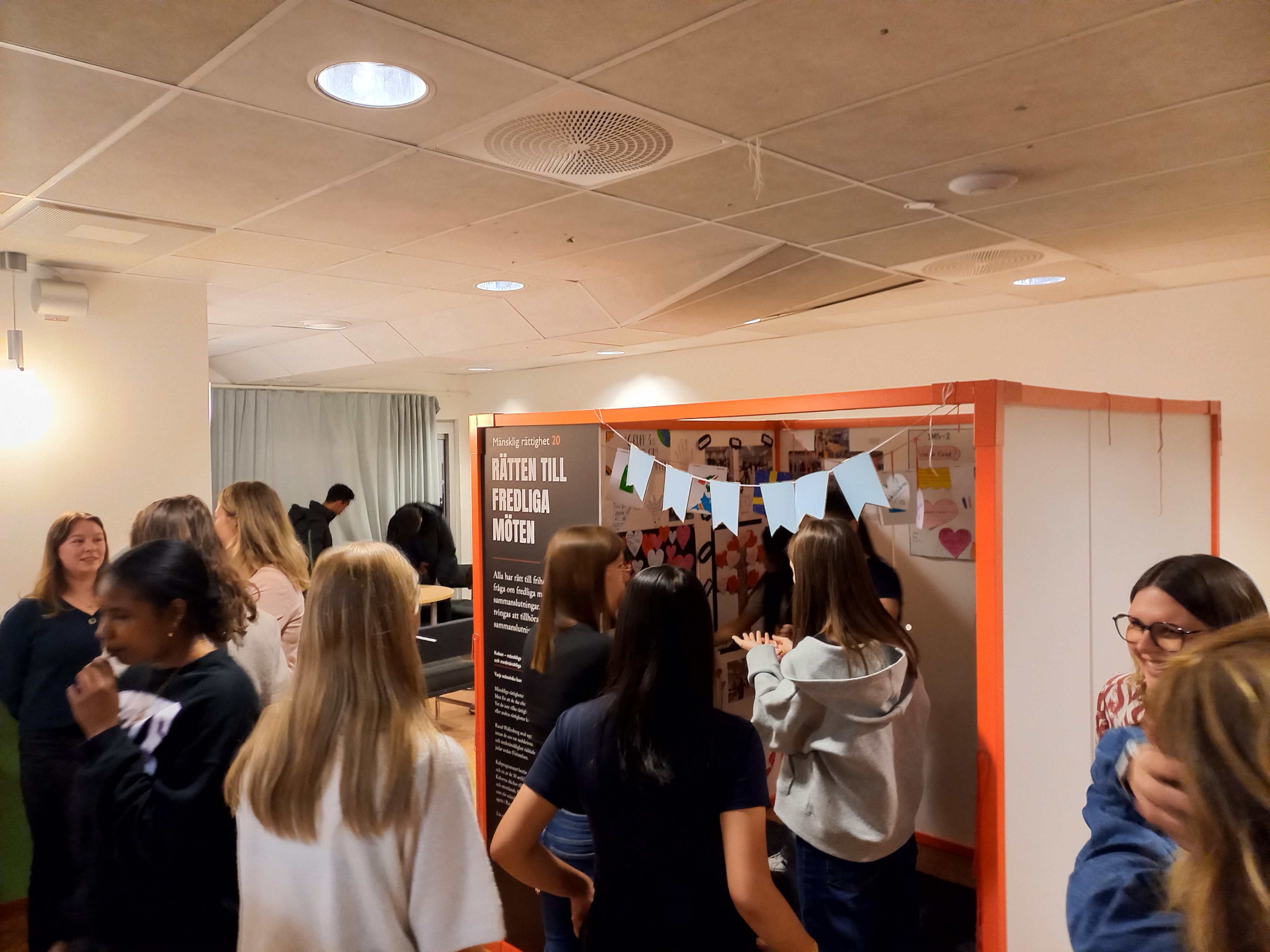 Detta år fick vi rätten till fredliga möten. Elever från olika program samarbetade i ett tvärvetenskapligt projekt med fokus på mänskliga rättigheten “rätten till fredliga möten”. Projektet bestod av två huvuddelar: Planering och genomförande av fredliga möten Eleverna organiserade och höll ett antal sammankomster där deltagare från skolan bjudits in. Syftet var att skapa en trygg arena för samtal kring mänskliga rättigheter, utbyta erfarenheter och bygga nya relationer genom gemensamma aktiviteter och samtal. Förändringsarbete i skolmiljön Gruppen kartlade en plats på skolan som upplevdes som otrygg och exkluderande. Utifrån sina insikter tog eleverna fram förslag på hur området kunde omvandlas till en inkluderande, grön och inbjudande mötesplats: nya möbler, växter och tavlor beställdes. Ljussättning och ny möblering skapade en mer inbjudande mijö. Allt detta ledde fram till en utställning i Kuben, där vi visade upp både utformningen av den nya mötesplatsen och lärdomarna kring hur man planerar och genomför ett fredligt möte. Utställningen invigdes i det nyrenoverade rummet och blev en naturlig avslutning och dokumentation av projektet