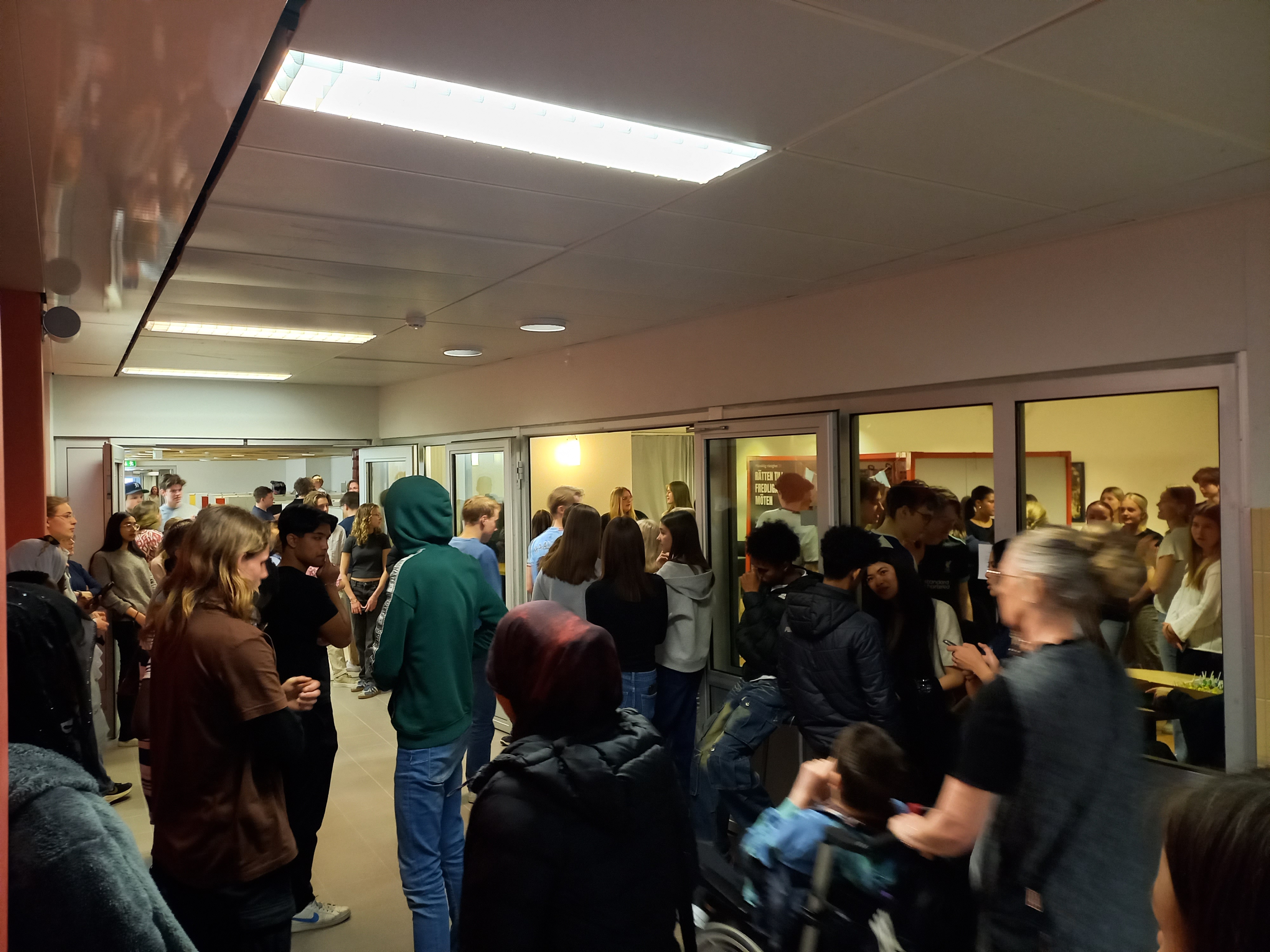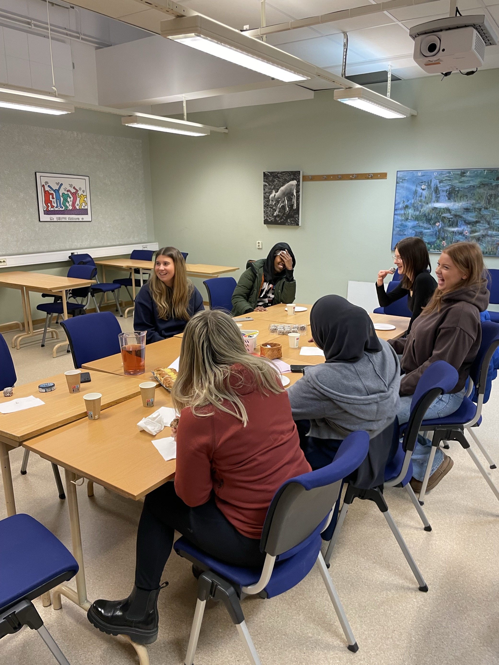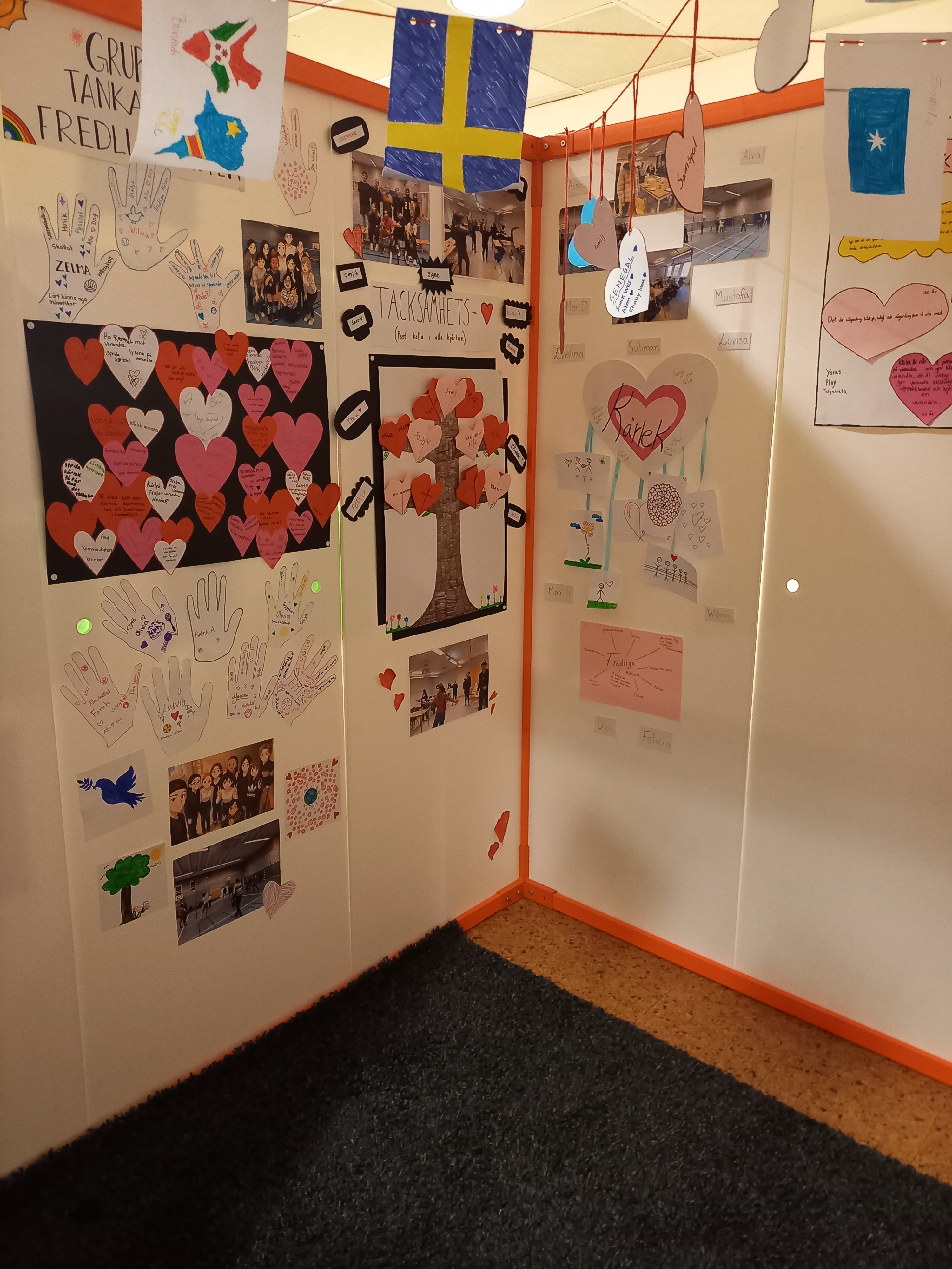 Detta år fick vi rätten till fredliga möten. Elever från olika program samarbetade i ett tvärvetenskapligt projekt med fokus på mänskliga rättigheten “rätten till fredliga möten”. Projektet bestod av två huvuddelar: Planering och genomförande av fredliga möten Eleverna organiserade och höll ett antal sammankomster där deltagare från skolan bjudits in. Syftet var att skapa en trygg arena för samtal kring mänskliga rättigheter, utbyta erfarenheter och bygga nya relationer genom gemensamma aktiviteter och samtal. Förändringsarbete i skolmiljön Gruppen kartlade en plats på skolan som upplevdes som otrygg och exkluderande. Utifrån sina insikter tog eleverna fram förslag på hur området kunde omvandlas till en inkluderande, grön och inbjudande mötesplats: nya möbler, växter och tavlor beställdes. Ljussättning och ny möblering skapade en mer inbjudande mijö. Allt detta ledde fram till en utställning i Kuben, där vi visade upp både utformningen av den nya mötesplatsen och lärdomarna kring hur man planerar och genomför ett fredligt möte. Utställningen invigdes i det nyrenoverade rummet och blev en naturlig avslutning och dokumentation av projektet